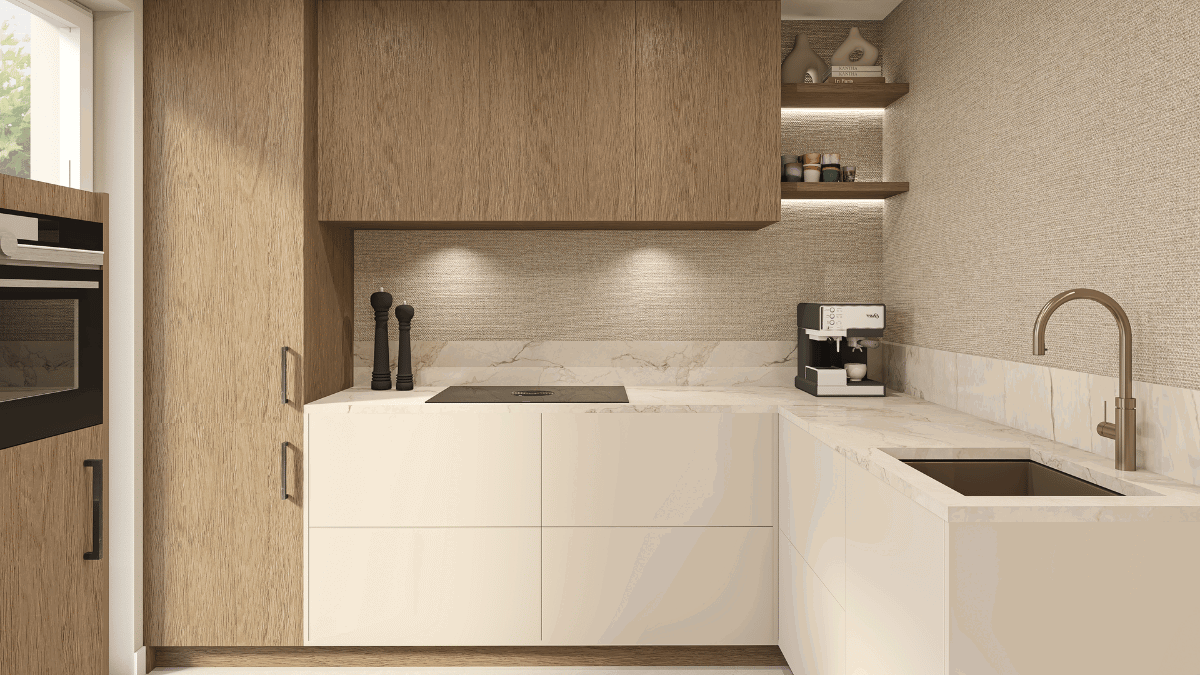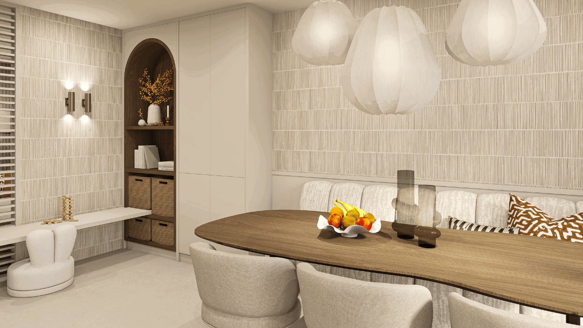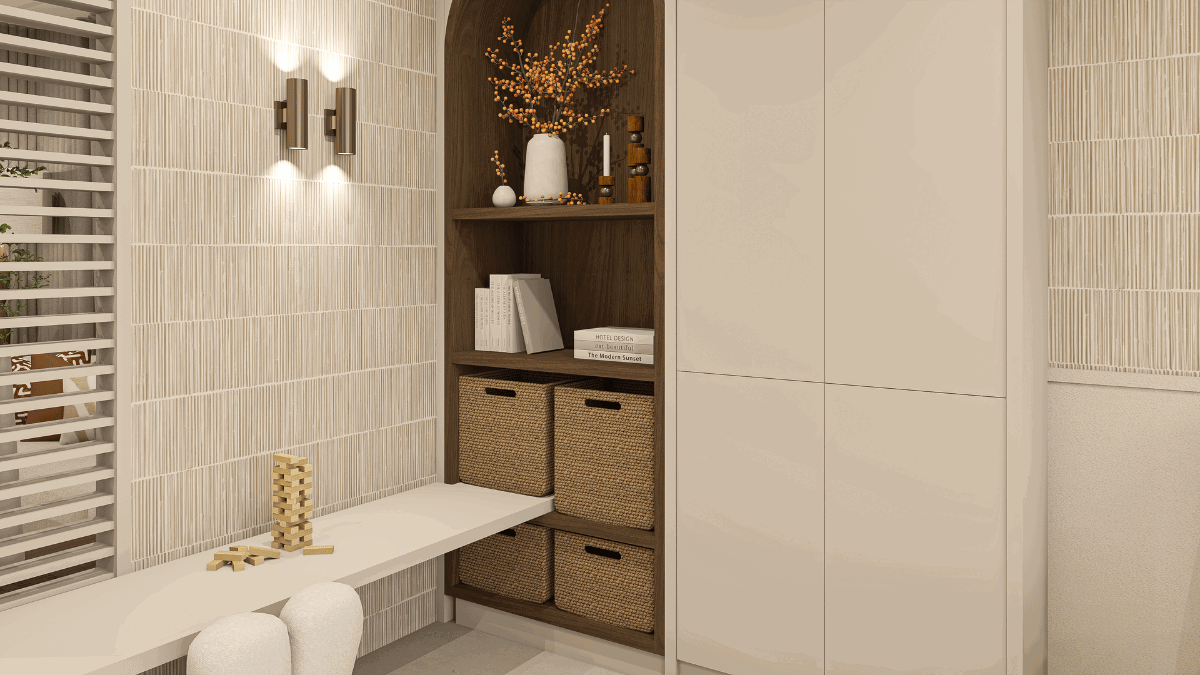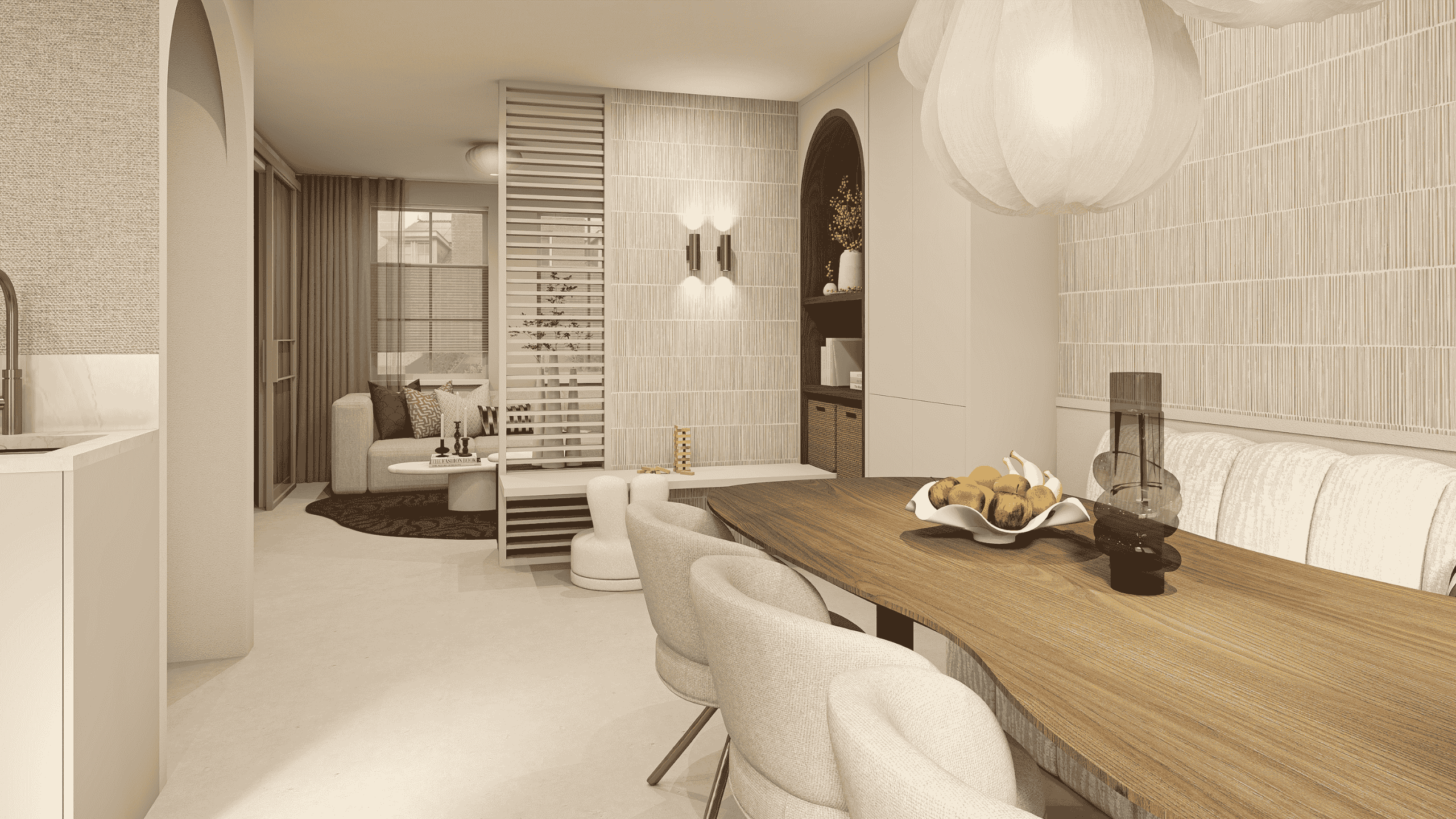 In dit interieur komen Japanse eenvoud en Scandinavische sferen samen. Zachte, natuurlijke kleuren vormen de basis en zorgen voor een warme uitstraling. Door het gebruik van lichte houttinten, rustige wandafwerkingen en minimalistische vormen ontstaat een interieur dat rustig aanvoelt, zonder kil te worden.