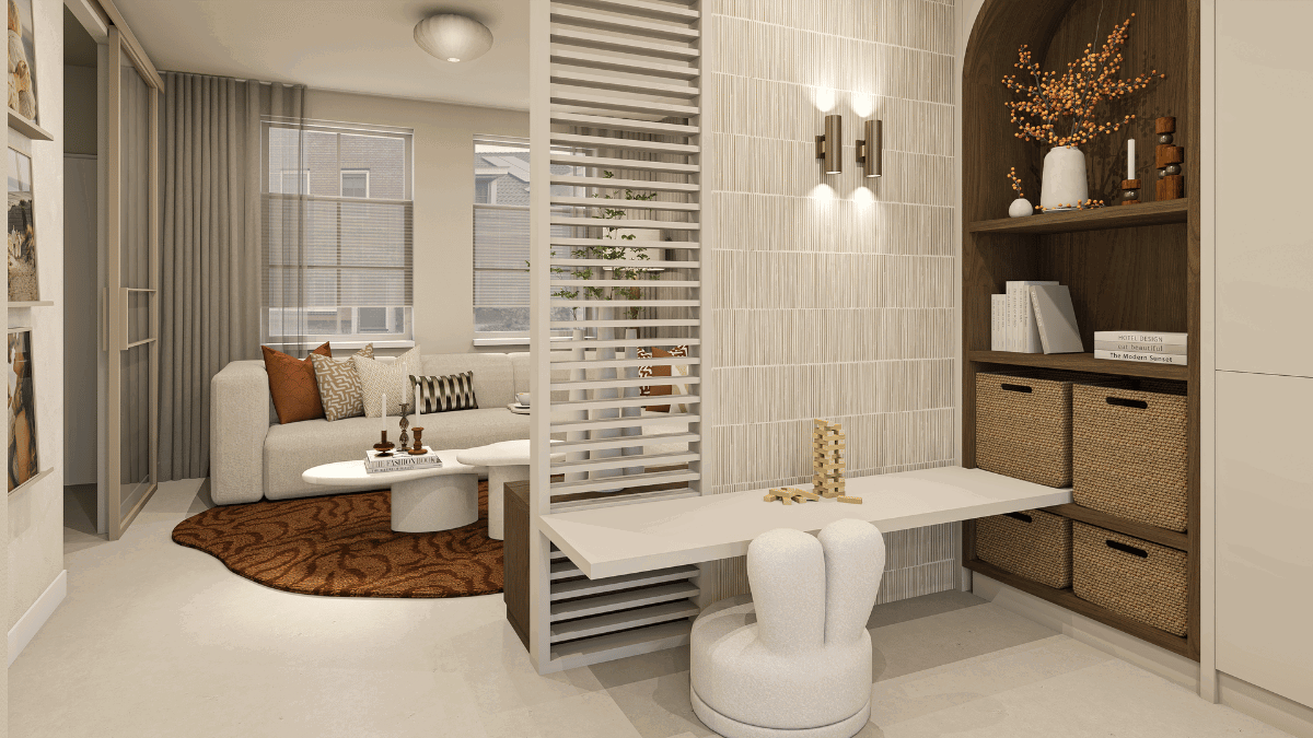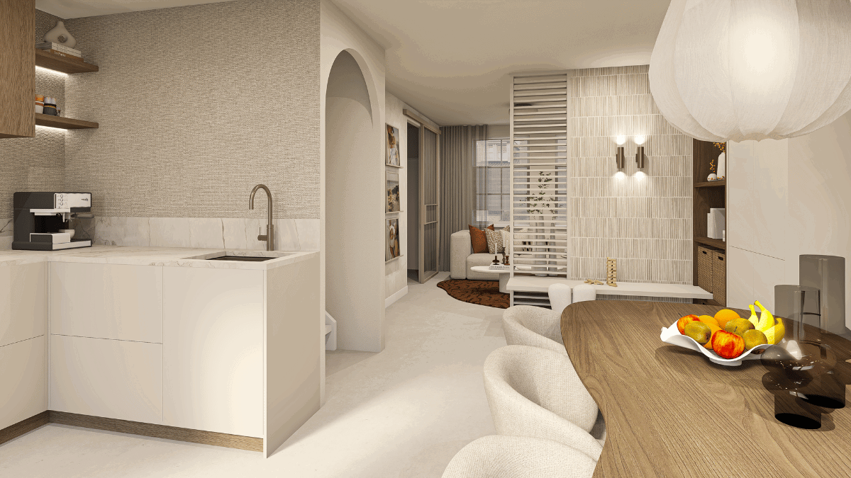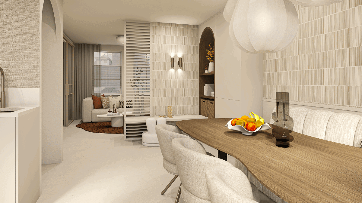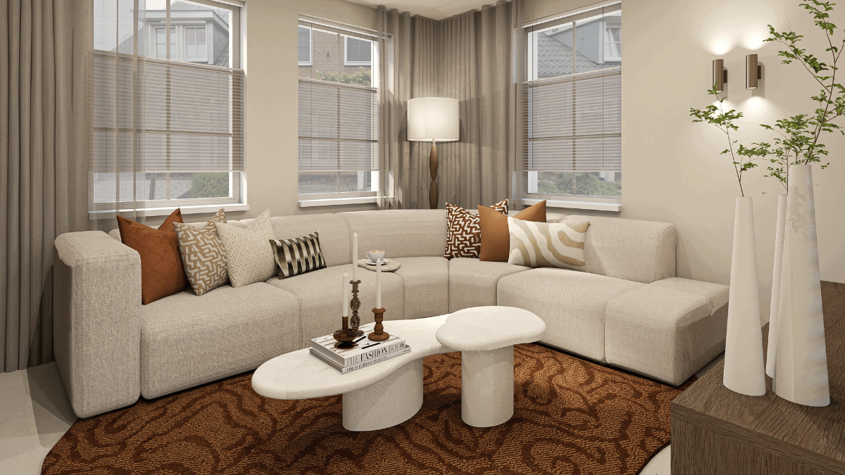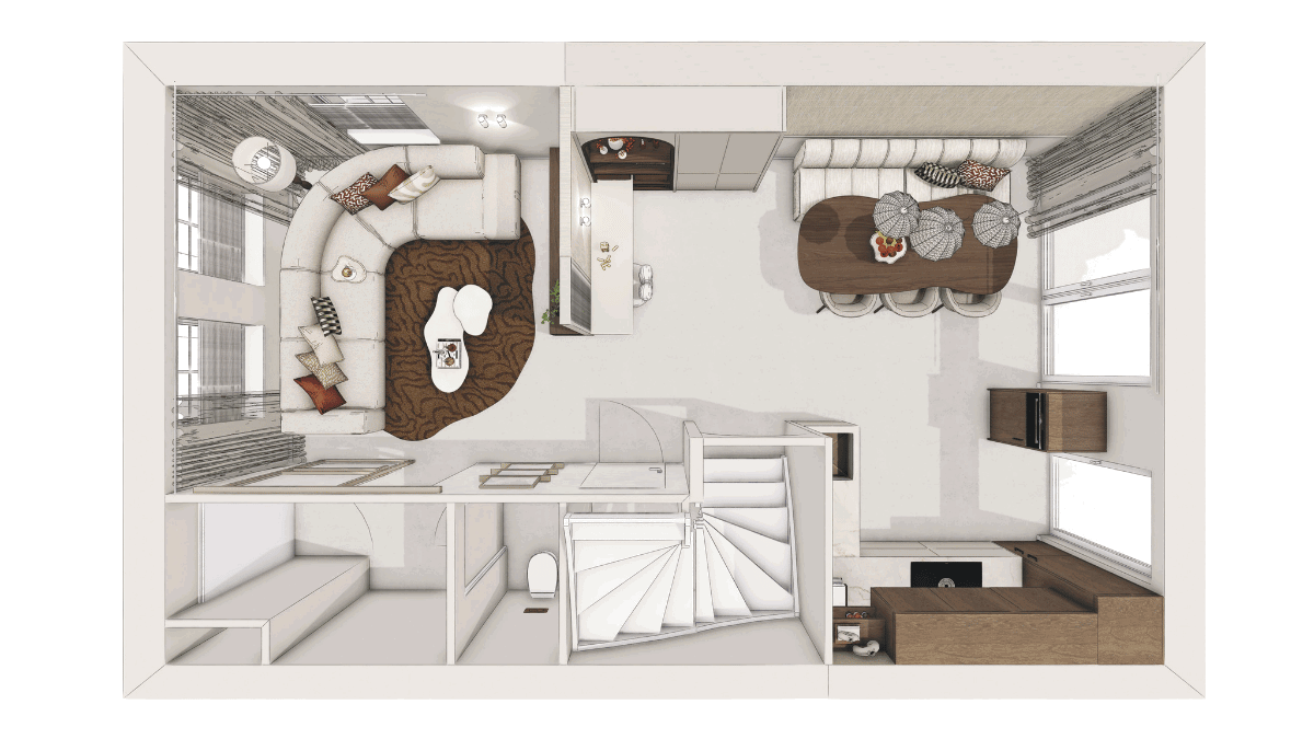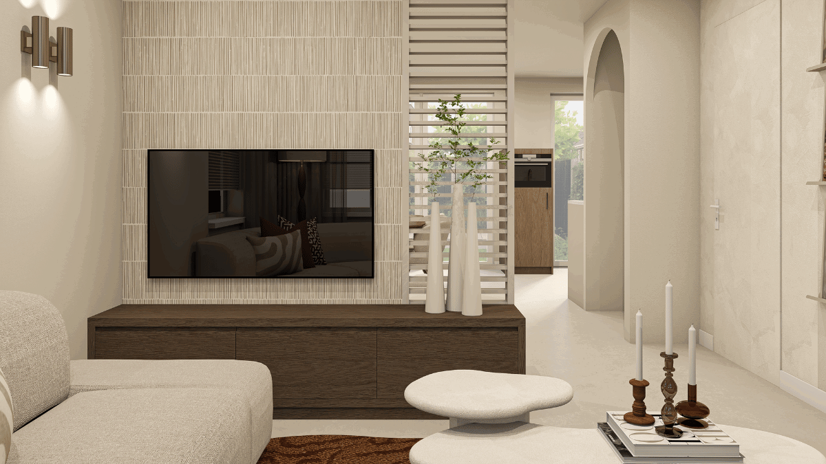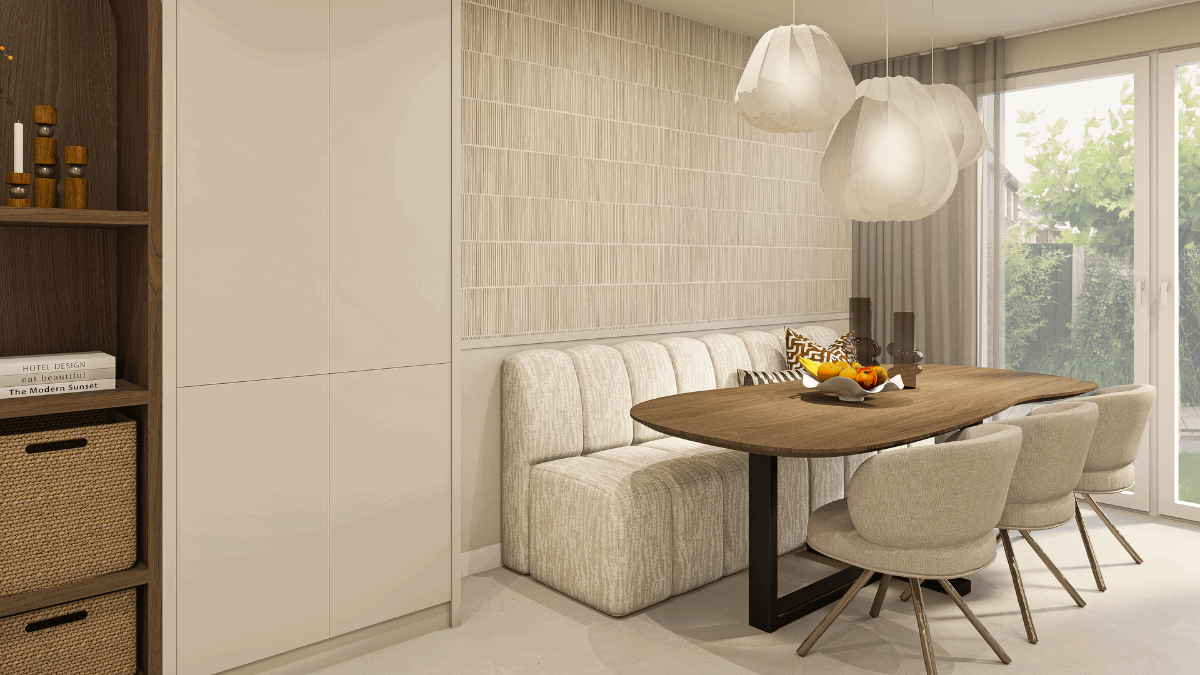 In dit ontwerp is bewust gekozen voor natuurlijke materialen en een rustig kleurenpalet. Denk aan hout, textiel met structuur en subtiele accenten die de ruimte karakter geven. Alles heeft een functie, maar niets voelt overbodig. De organische vormen van het meubilair en de zachte belijning zorgen voor een warme, huiselijke sfeer. Zo blijft het interieur licht, overzichtelijk en prettig.